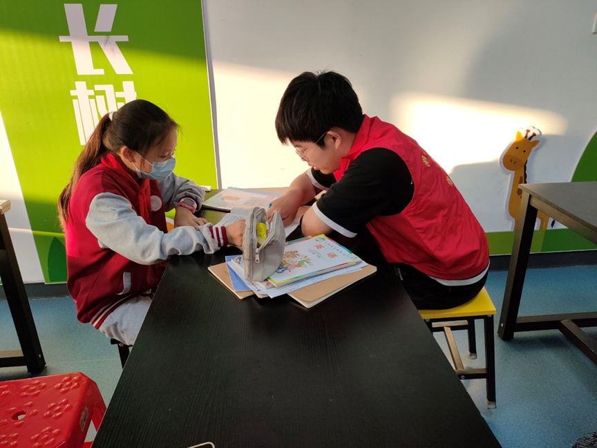 (图为志愿者辅导小朋友完成作业)