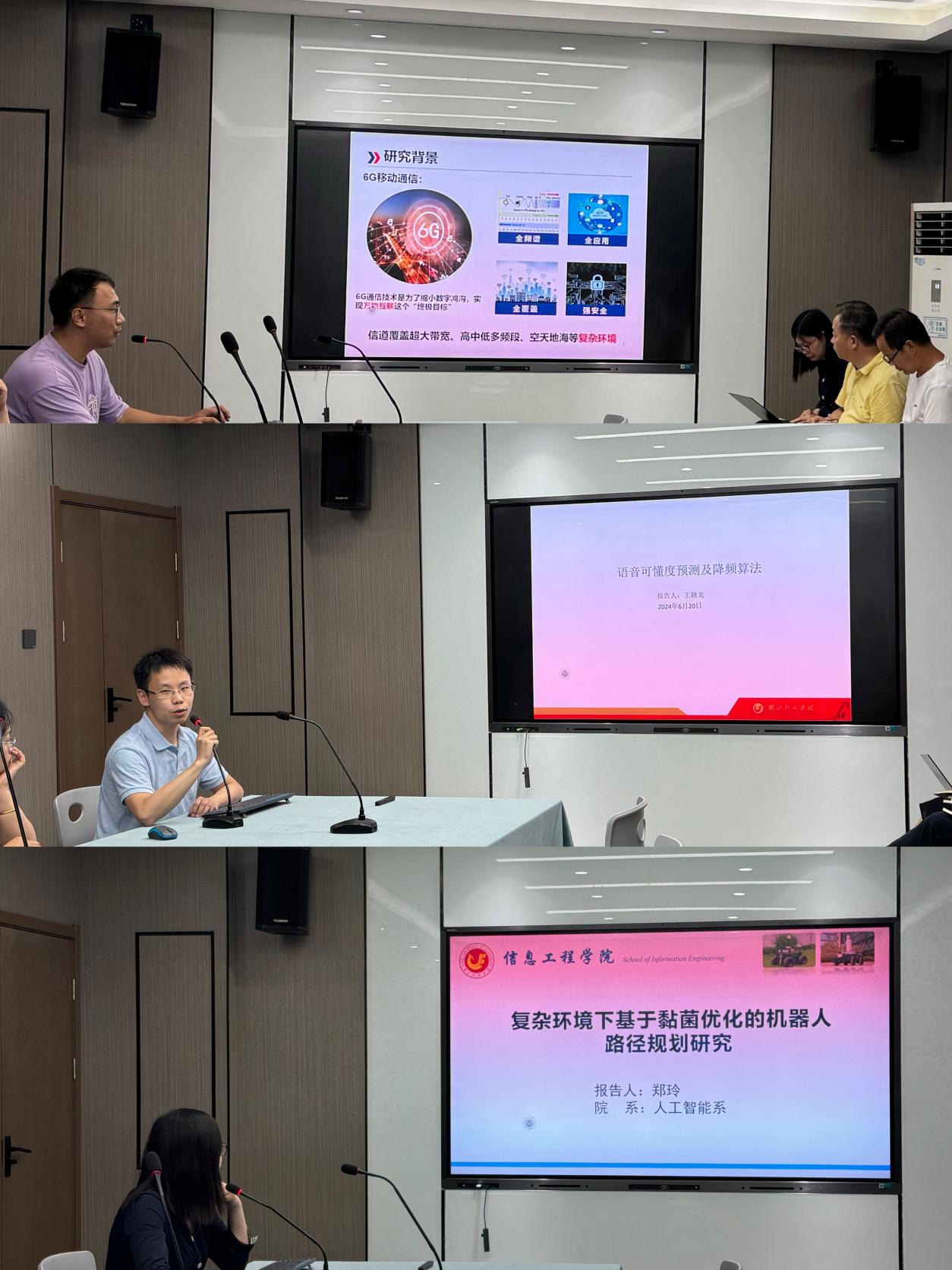 张旭帆博士首先带来了题为“OTFS信号智能检测研究”的学术报告。他详细介绍了研究背景与意义,并深入探讨了智能检测技术在OTFS信号中的应用。王赣龙博士分享了“语音可懂度预测及降频算法”的研究成果,详细阐述了语音可懂度预测的重要性以及降频算法在语音处理中的实际应用。最后,郑玲博士围绕“复杂环境下基于黏菌优化的机器人路径规划研究”进行了精彩报告,介绍了黏菌优化算法的基本原理和优势,并阐述了该算法在机器人路径规划中的创新应用。