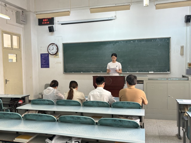 10月12日,现场答辩在教学楼一号楼教室举行。本次答辩分四组进行,每组答辩评委由教工党员和员工党员担任。答辩题目包括问答题、时政题和主观题。