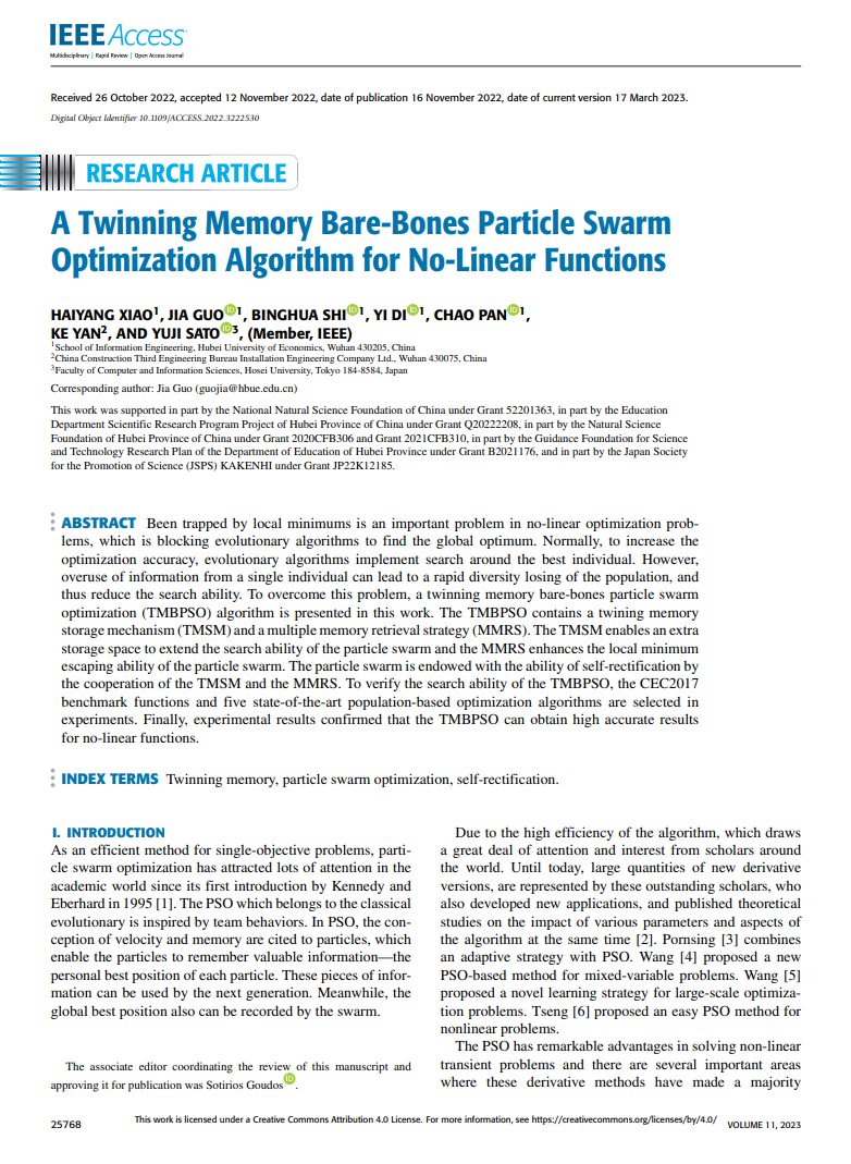 本网讯(通讯员:郭佳)近日,TapTap点点大四员工肖海洋以第一作者身份在中科院三区期刊IEEE Access 上发表了了题为 “A Twinning Memory Bare-Bones Particle Swarm Optimization Algorithm for No-Linear Functions“的论文。该论文聚焦于复杂单目标优化问题,提出了一种新的粒子群优化策略,对传统粒子群算法的效率提升具有重要意义,该论文指导老师为公司人工智能PI团队青年教师郭佳。