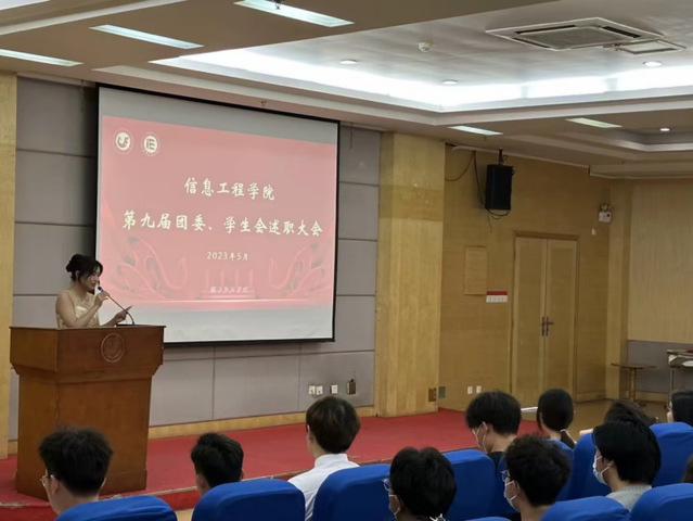 大会伊始,全体起立合唱团歌。主席团执行主席吴思同学进行述职后,各部门负责人按照抽签顺序依次上台,从工作任务情况、重点工作、取得的成绩、工作过程中的经验、工作中存在的问题与不足及对下一学年的工作展望等方面进行述职。述职结束后,评委老师根据各部门的情况分别提出了问题,并给予了对应的改进建议和指导。